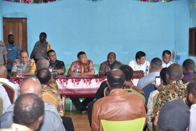 Jayapura, Nokenlive.com – Pasca Penembakan oleh KKSB di bandara keneyam Kabupaten Nduga yang menewaskan tiga warga sipil dan melukai 3 warga lainnya yang berimbas pada terhambatnya proses pilkada di Nduga, Pada hari Jumat (29/06/2018) pukul 11.30 wit, Kapolda Papua Irjen Pol Drs. Boy Rafli Amar, MH bersama dengan PJ Gubernur Provinsi Papua, Pangdam XVII/Cenderawasih, Kabinda Papua dan Bupati Kabupaten Nduga melaksanakan tatap muka dengan para Kepala Distrik, tokoh adat dan tokoh masyarakat Kabupaten Nduga di hotel Baliem velly Distrik Kenyam Kabupaten Nduga Papua.