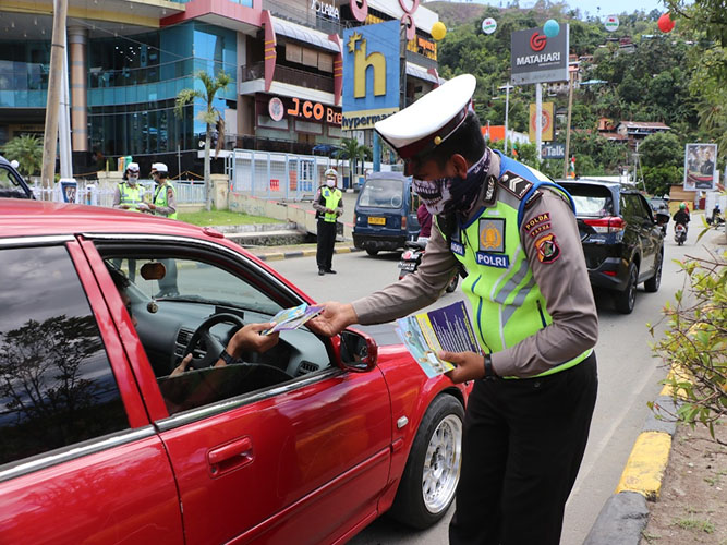 Jayapura, Nokenlive.com – Bertempat di depan Mall Jayapura, Selasa (31/03) Dit Lantas Polda Papua melaksanakan pembagian stiker Kamseltibcar Lantas dan Pencegahan Virus Corona (Covid-19) pada pengguna jalan.