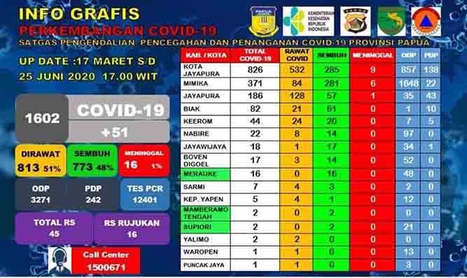 Jayapura, Nokenlive,com – Tim Satgas Penanganan COVID-19 Papua mengatakan ada penambahan 51 warga yang positif COVID-19 hingga seluruhnya tercatat 1.602 orang.