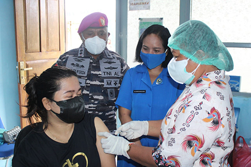 Peninjauan kegiatan vaksinasi, oleh Komandan Lanal Biak, Letkol Mar Karlos R. Deda. Didampingi Ketua Jalasenastri Lanal Biak, Cabang 2 Korcab X DJA III Ny. Christa Karlos R. Deda, Karumkital dan Pasintel Lanal Biak.