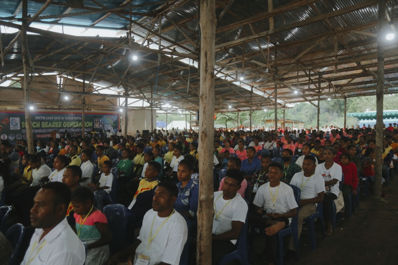 Gema Waropen Hebat berkumandang pada pembukaan kegiatan besar keagamaan Gereja Pantekosta Youth Camp GPDI se-Tanah Papua, yang digelar di Bumi Perkemahan Gharmisi di Kampung Rorisi, Distrik Urei Faisei, Senin (27/6).