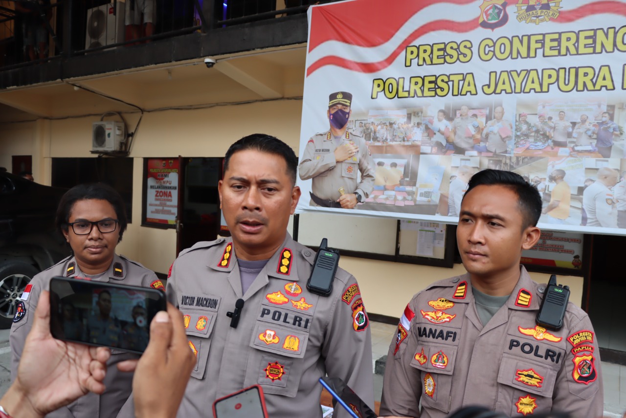 Kapolresta Jayapura Kota Kombes Pol Dr. Victor D. Mackbon, S.H., S.IK., M.H., M.Si saat memberikan keterangan pres kepada sejumlah awak media terkait aksi demo dilakukan KNPB memperingati hari HAM Internasional.(FOTO HUMAS POLRESTA)