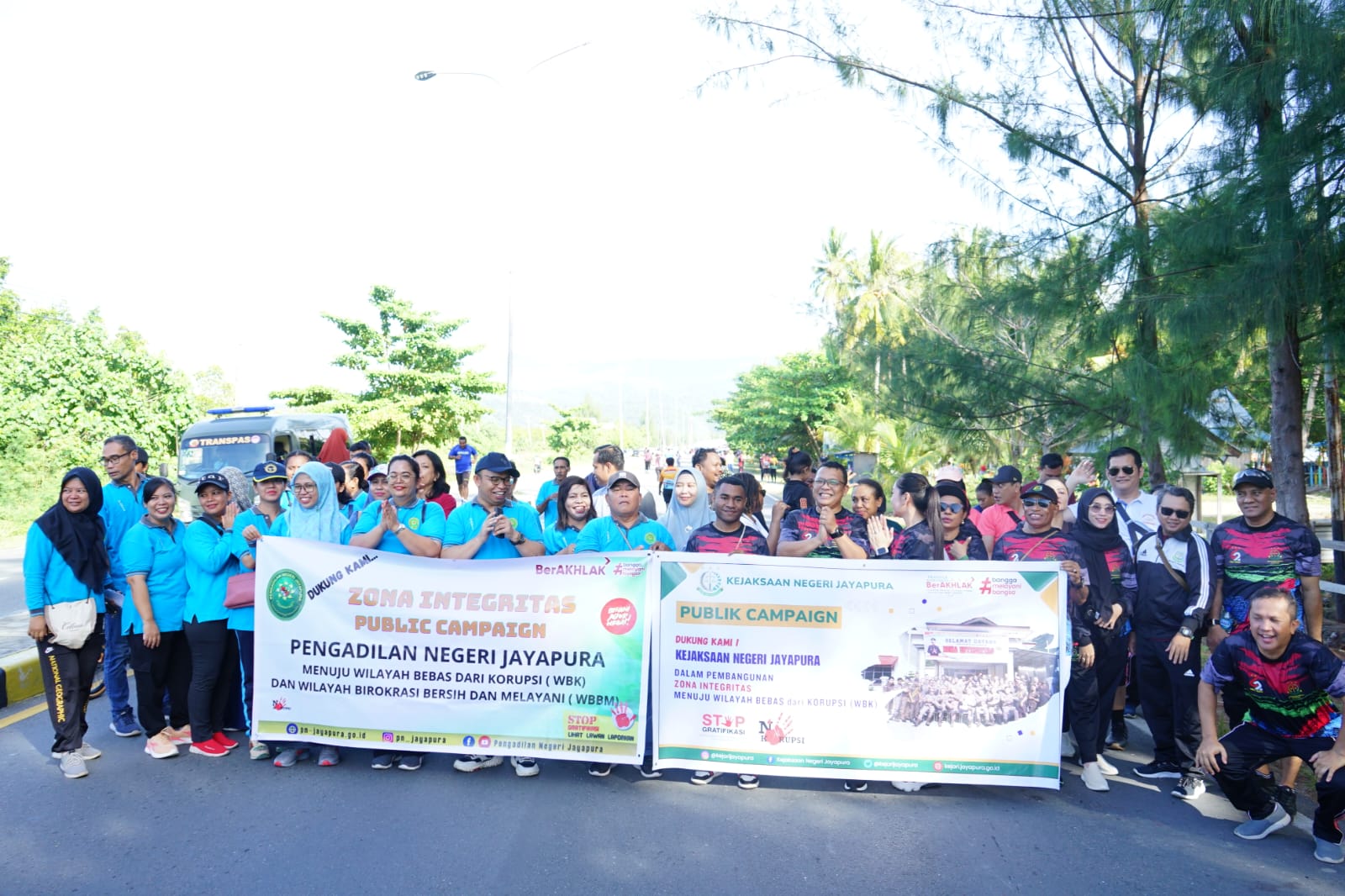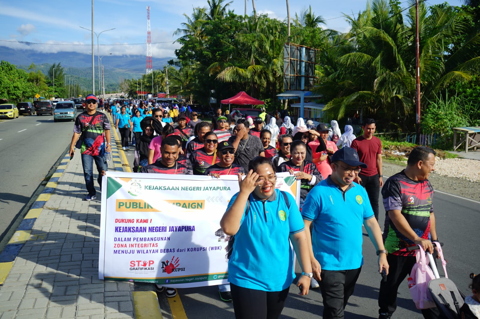 Turut hadir dalam kegiatan jalan santai sambil kampanye wilayah bebas korupsi ini yakni Kepala Kejaksaan Negeri Jayapura dan Ketua Pengadilan Negeri Kelas 1A Jayapura.