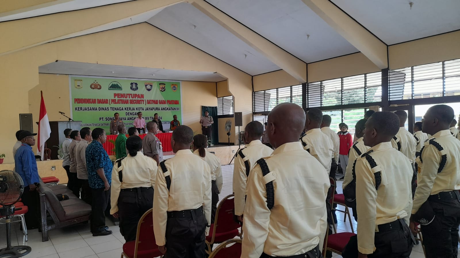 Penutupan Pendidikan Dasar Pelatihan Satpam gada pratama bagi tenaga satpam Orang Asli Papua di Kota Jayapura oleh Asisten III Setda Kota Jayapura Nur Bi Adji.
