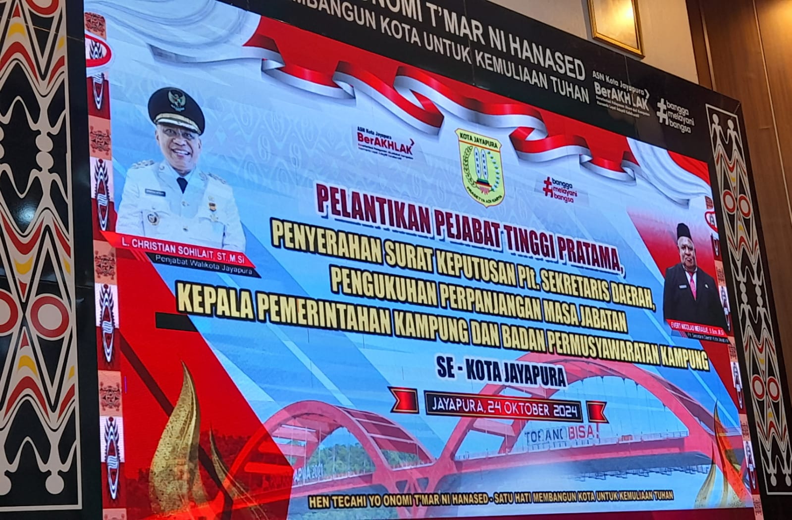 Kegiatan Pelantikan Pejabat Tinggi Pratama, Penyerahan SK Plt Sekda, dan Pengukuhan Perpanjangan Masa Jabatan Kepala Kampung dan Bamuskam Se Kota Jayapura Tahun 2024, dihadirip Forkompinda Kota Jayapura, Para Kepala Sekolah dan Pimpinan OPD di Lingkungan Pemerintah Kota Jayapura.