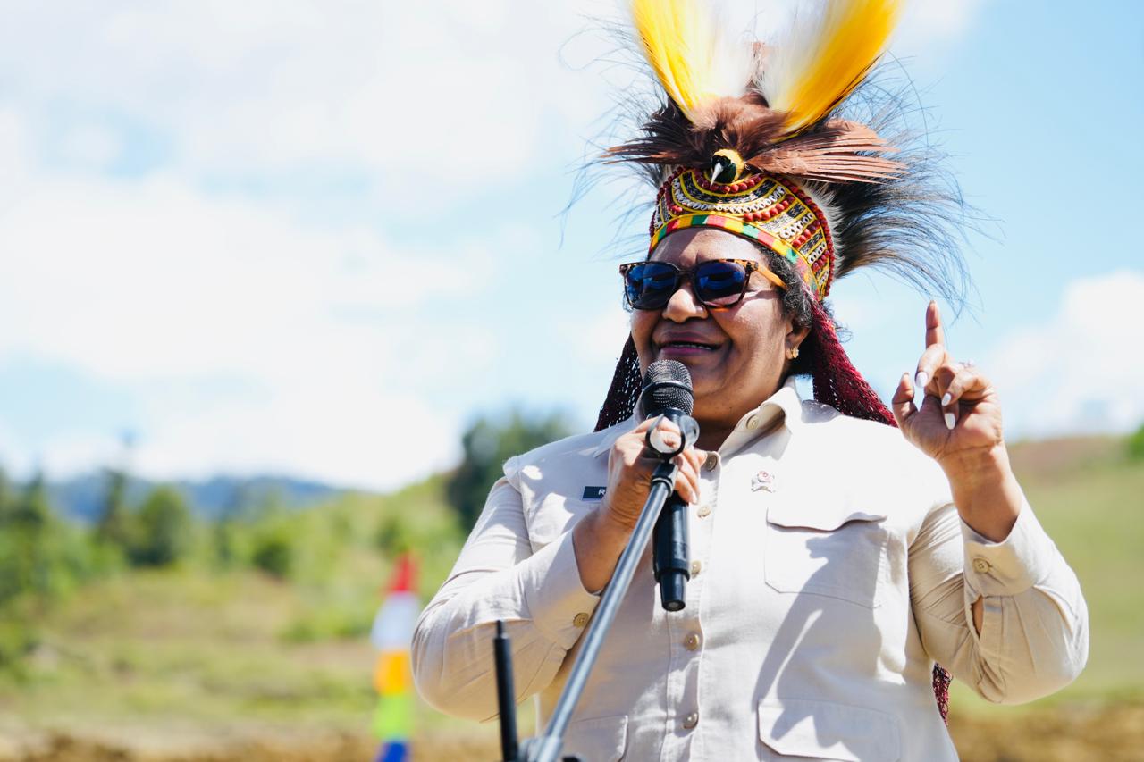 Wakil Menteri Dalam Negeri, Dr. Ribka Haluk, saat memberikan sambutan dalam kunjungan kerja di Wamena, Papua Pegunungan. Kunjungan ini menegaskan komitmen pemerintah pusat dalam mendorong percepatan pembangunan infrastruktur pemerintahan di daerah otonomi baru ( DOB ) Wamena,16/05/2025