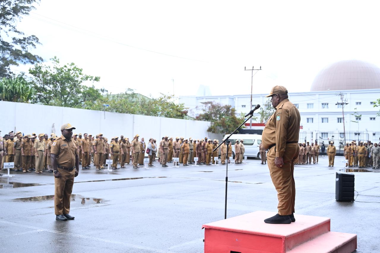 Penjabat Sekretaris Daerah Provinsi Papua Pegunungan, Wasuok Demianus Siep, memimpin apel pagi di lingkungan Pemerintah Provinsi Papua Pegunungan, Senin (8/9/2025). Foto: Humas Pemprov Papua Pegunungan
