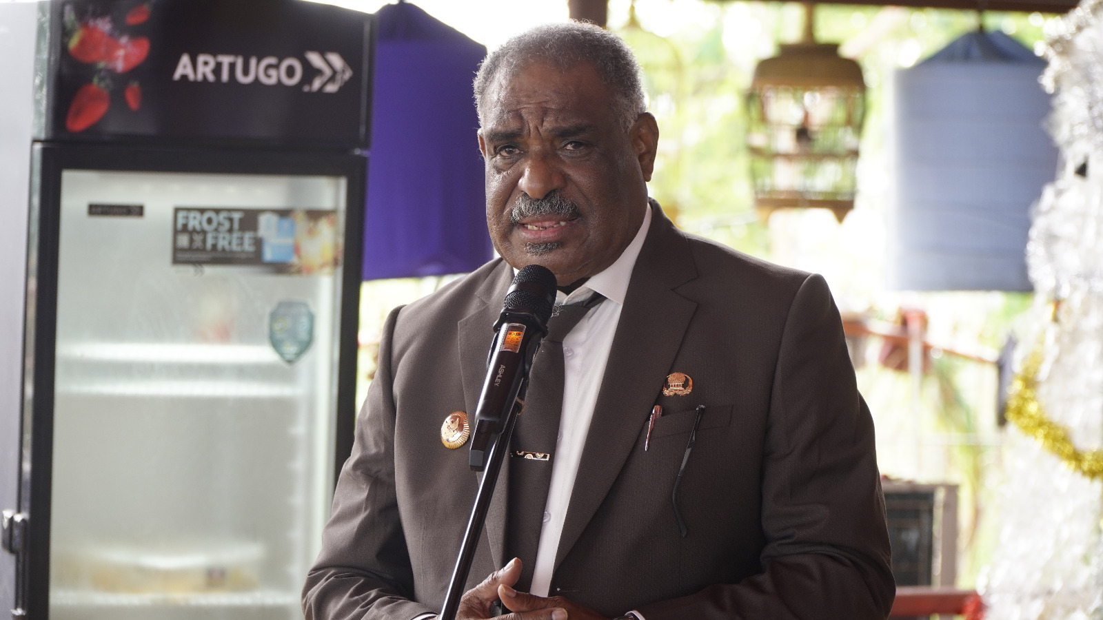 Walikota Jayapura, Abisai Rollo, saat memberikan sambutan disela-sela penyerahan bantuan 100 ekor babi ke pihak Gereja di Kota Jayapura, Jumat (19/12/2025). Foto: Humas Pemkot Jayapura