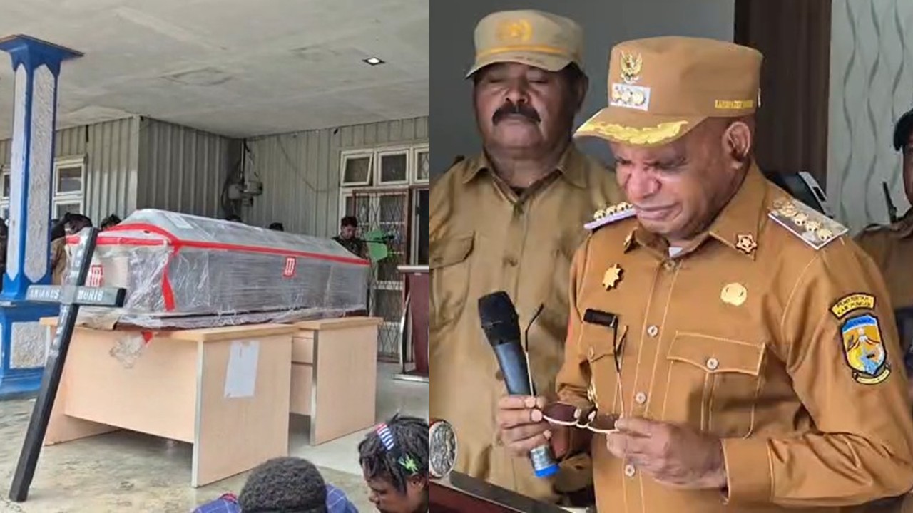 Bupati Puncak Elvis Tabuni tak kuasa menahan tangis saat menyerahkan jenazah kepada pihak keluarga, sekaligus menyampaikan belasungkawa dan bantuan duka dari pemerintah daerah.