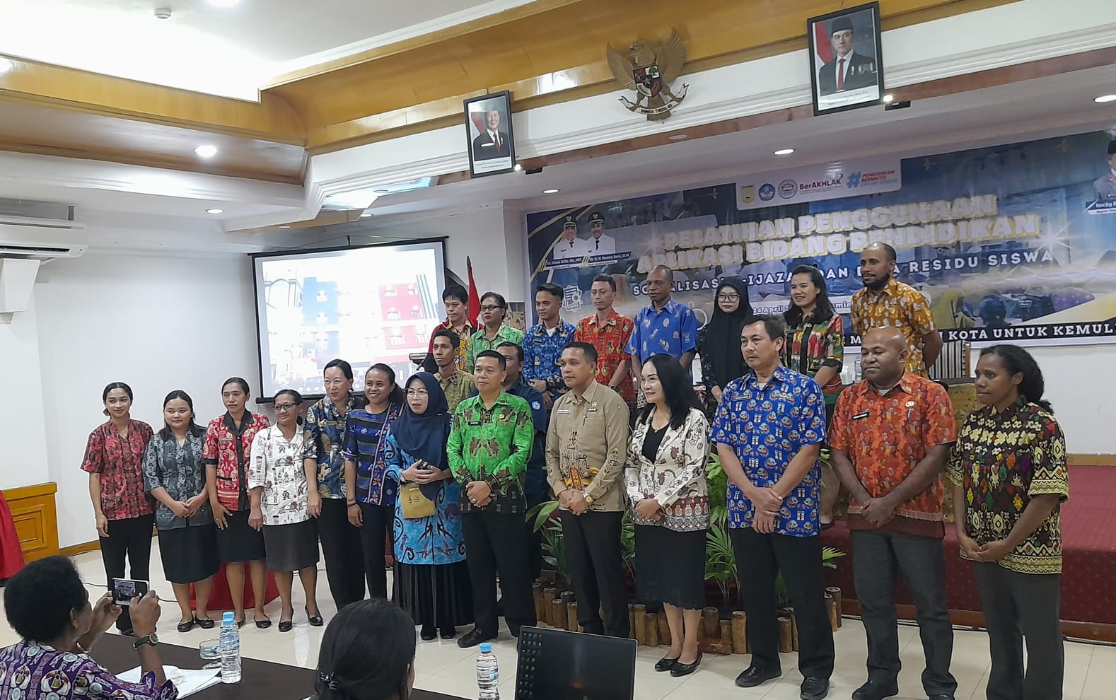 Foto : Andika Keterangan Foto: Kepala Dinas Pendidikan dan Kebudayaan Kota Jayapura, Rocky Bebena (tengah hijau), bersama Kabid SD Ellen Montolalu dan para peserta sosialisasi usai seremoni pembukaan kegiatan.